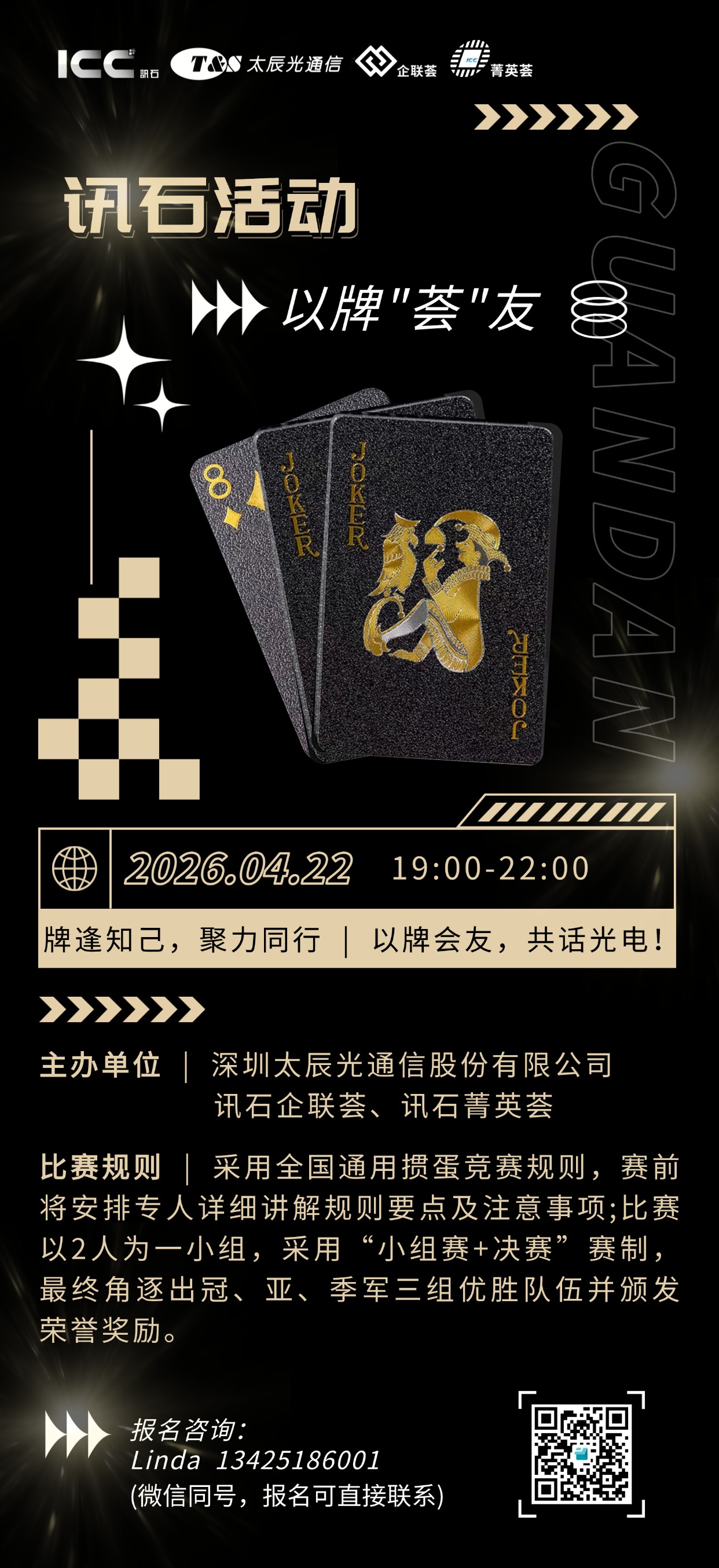 ICC訊 牌逢知己,聚力同行;以牌"薈"友,共話光電!為迎接OSIC 2026 第 3 屆 AI + 光電智聯(lián)大會,提前搭建光通信行業(yè)高效交流橋梁,讓行業(yè)同仁卸下忙碌、輕松破冰,訊石企聯(lián)薈聯(lián)合訊石菁英薈、深圳太辰光通信股份有限公司,特于大會前夕重磅打造「訊石活動?以牌 “薈” 友 —— 光通信摜蛋友誼賽」!