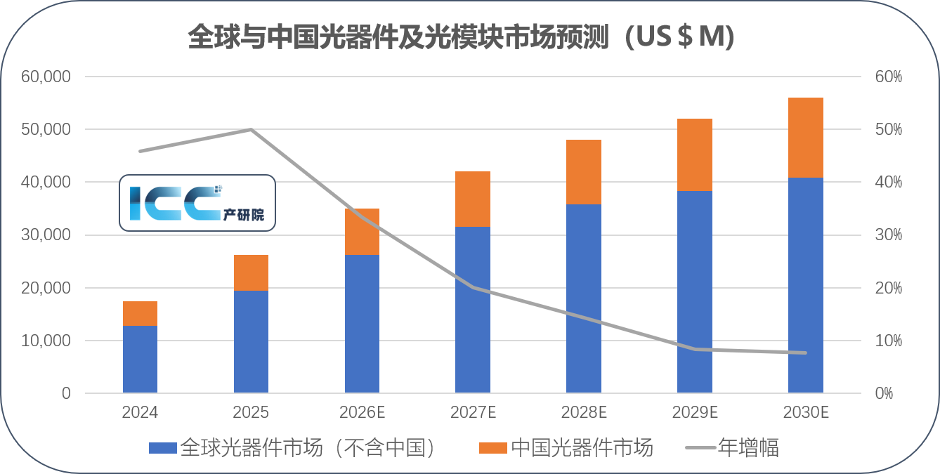 ICC產(chǎn)研院發(fā)布了最新的《全球光通訊市場現(xiàn)狀分析及預(yù)測(2026)》報告。報告指出,2025年全球光器件市場規(guī)模達到262.5億美元,同比增長50%,創(chuàng)下歷史新高;預(yù)計到2030年將增長至560億美元,年復合增長率約16.4%。未來3-5年,光通信將從“通信基礎(chǔ)設(shè)施”升級為“智能經(jīng)濟的關(guān)鍵底座”。能夠有效管理供應(yīng)鏈、掌握核心芯片能力、并在硅光、CPO、OCS、空芯光纖、薄膜鈮酸鋰等下一代技術(shù)上取得領(lǐng)先的廠商,將在長周期競賽中占據(jù)有利位置。