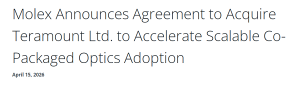 ICC訊 美國伊利諾伊州Lisle — 2026年4月15日 — 全球電子行業(yè)領(lǐng)導(dǎo)者和連接技術(shù)創(chuàng)新企業(yè)Molex今日宣布,已達(dá)成協(xié)議收購Teramount Ltd.。Teramount是一家位于以色列的公司,專門開發(fā)用于大批量共封裝光學(xué)(CPO)及其他硅光應(yīng)用的可拆卸光纖到芯片(Fiber-to-chip)連接方案。