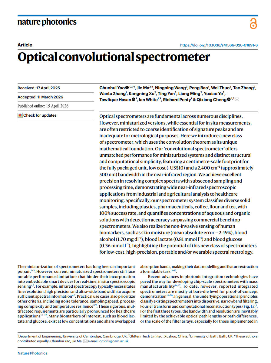 近日,一個來自中國的團隊——徐州光引科技發(fā)展有限公司與劍橋大學(xué)團隊聯(lián)合宣布,成功研制出一種名為“光學(xué)卷積光譜儀”(Optical Convolutional Spectrometer)的面向量產(chǎn)的革命性片上光譜系統(tǒng),革新了智能終端的交互邏輯。不僅解決了微型光譜儀性能、體積與成本的“不可能三角”難題,還讓可穿戴設(shè)備從“記錄型電子產(chǎn)品”升級為真正意義上的“個性化智能健康管家”成為可能。這項突破性成果已發(fā)表于國際頂級期刊《自然·光子學(xué)》(Nature Photonics)。
