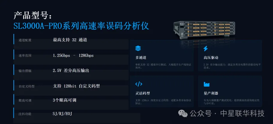 除224G系列外,中星聯(lián)華還同步展示了面向消費(fèi)電子接口的SL3000BX系列及支持32通道的SL3000A Pro 112G系列,構(gòu)建了全方位的測(cè)試矩陣。