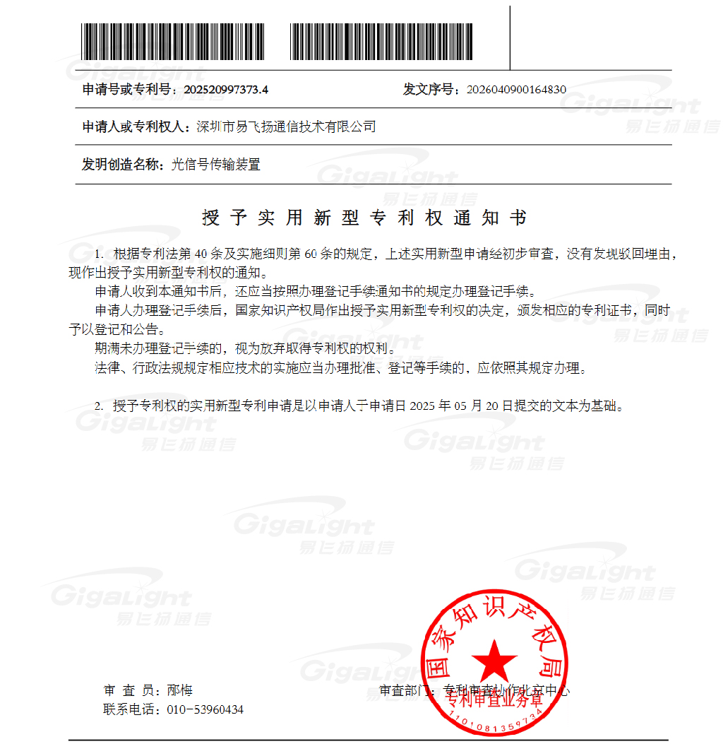 ICC訊 [中國,深圳,2026年4月17日]即日從知識產(chǎn)權(quán)局獲悉,易飛揚(GIGALIGHT)于2025年5月提交的一種外置光源的800G/1.6T/3.2T可插拔硅光模塊獲得實用新型專利授權(quán),發(fā)明專利權(quán)利處于實審中。